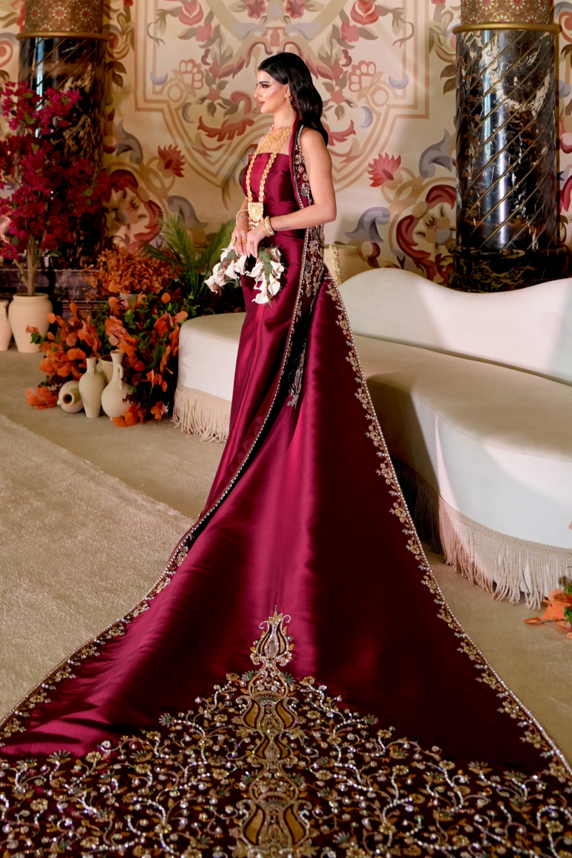 فستان عرايس ملكي باللون البرغندي الفاخر، مصنوع من قماش الميكادو الثقيل اللامع بقصة ضيّقة تبرز جمال القوام، ويتّصل بذيل طويل جدًا مزيّن بتطريز فاخر ويدوي بالكامل بكريستالات لامعة بتوزيع دقيق ومتناسق. التصميم يتميّز بفخامة استثنائية، ويُعد خيارًا مثاليًا للعرايس الباحثات عن إطلالة ملكية فريدة.