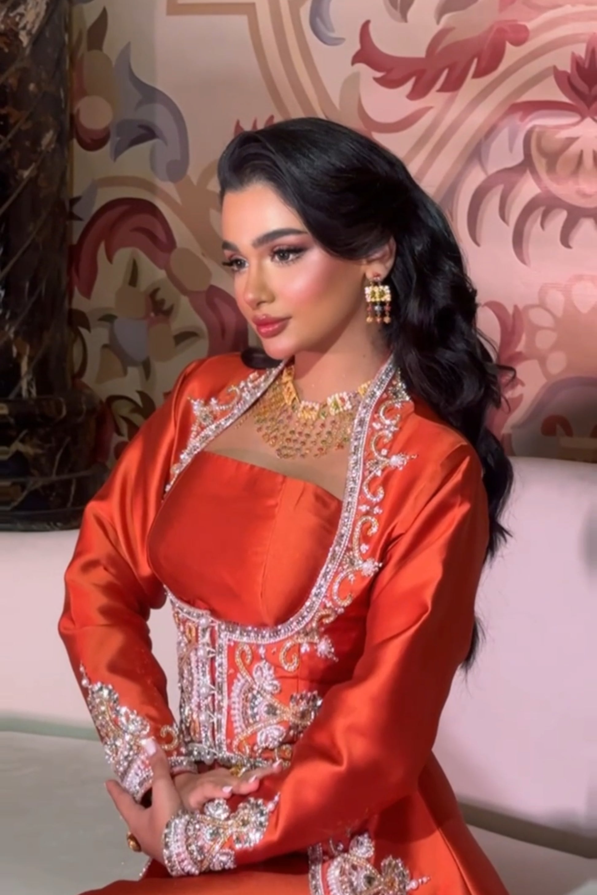 Elegant orange mikado dress, hand-embroidered with sparkling gold and silver crystals for a radiant look. The refined design features rich embellishments on the sleeves and borders, adding a graceful touch. Perfect for a glamorous Henna Night or any special occasion.