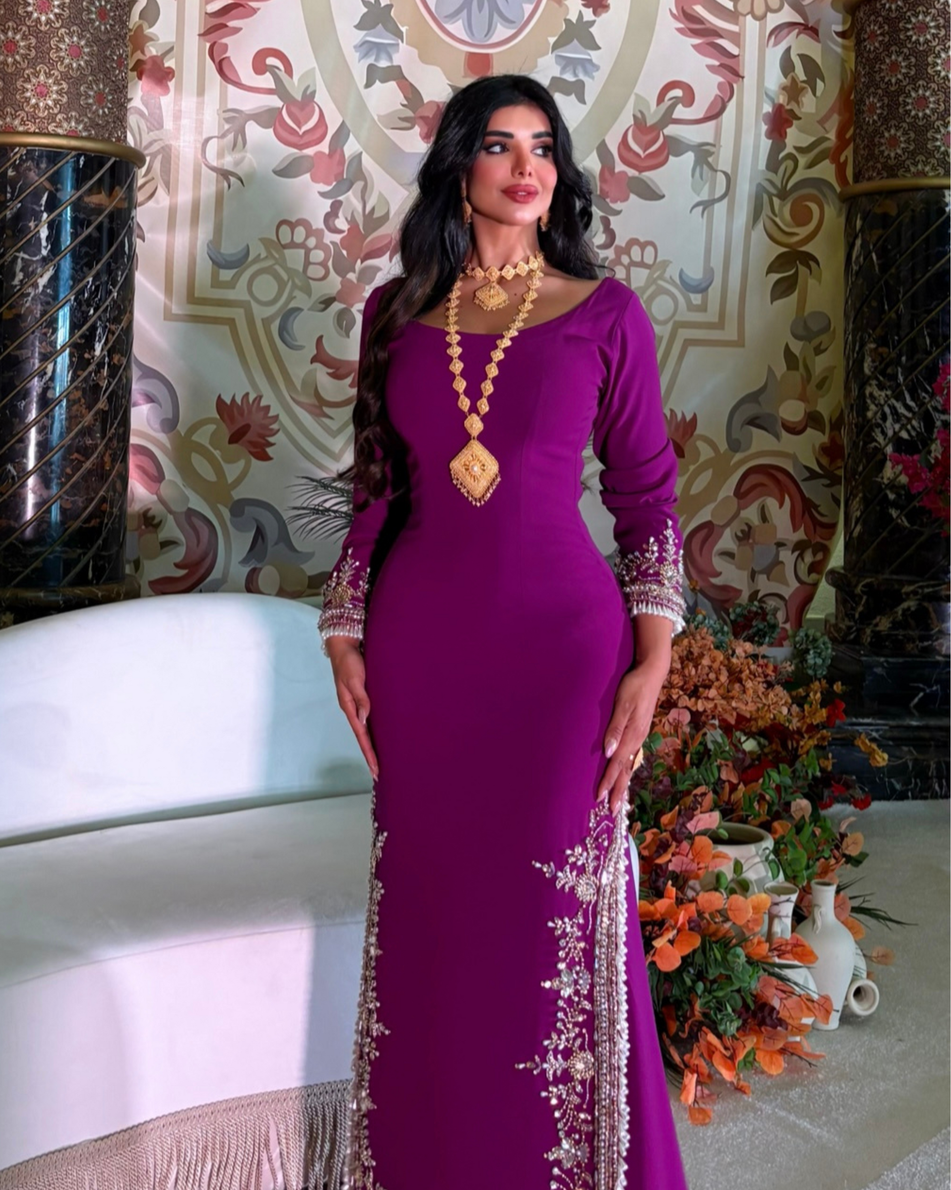 A luxurious deep purple gown crafted from premium crepe fabric, adorned with intricate hand-embroidered crystals along the sleeves, sides, and back. Designed with a flattering silhouette that enhances the figure, offering a regal and captivating presence, perfect for upscale events and unforgettable moments.