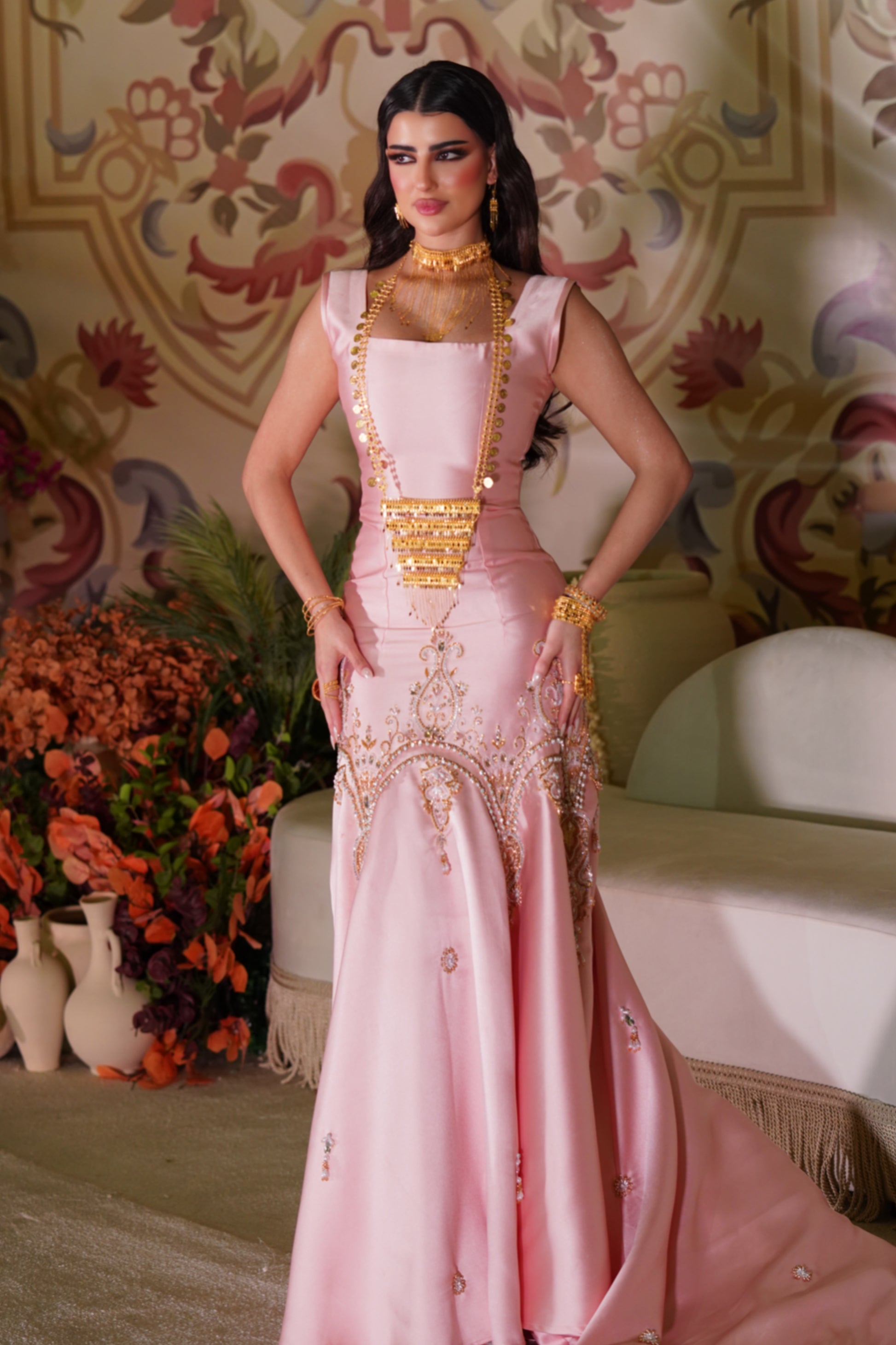An elegant bridal gown in light pink, crafted from premium Mikado fabric with a sleek, body-contouring silhouette. The gown features exquisite hand embroidery in golden crystal and bead detailing around the waist and hips. A soft train with delicate embellishments completes the look, offering a graceful and modern style.