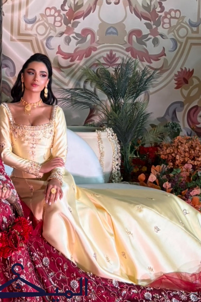 Luxurious light yellow gown crafted from premium Mikado fabric, embellished with shimmering hand-embroidered crystals gracefully spread throughout the dress. Featuring elegant long sleeves and a square neckline for a refined royal look, complemented by a fully embroidered train that enhances the overall opulence and sophistication.