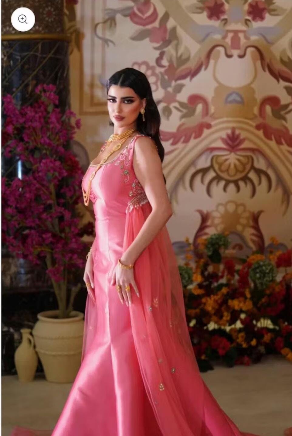 A luxurious royal pink gown crafted from premium Mikado fabric, designed to enhance the feminine silhouette. Features intricate hand embroidery with shimmering crystals on the back, paired with a gracefully flowing tulle draping from behind. Perfect for events that call for a bold and elegant appearance.