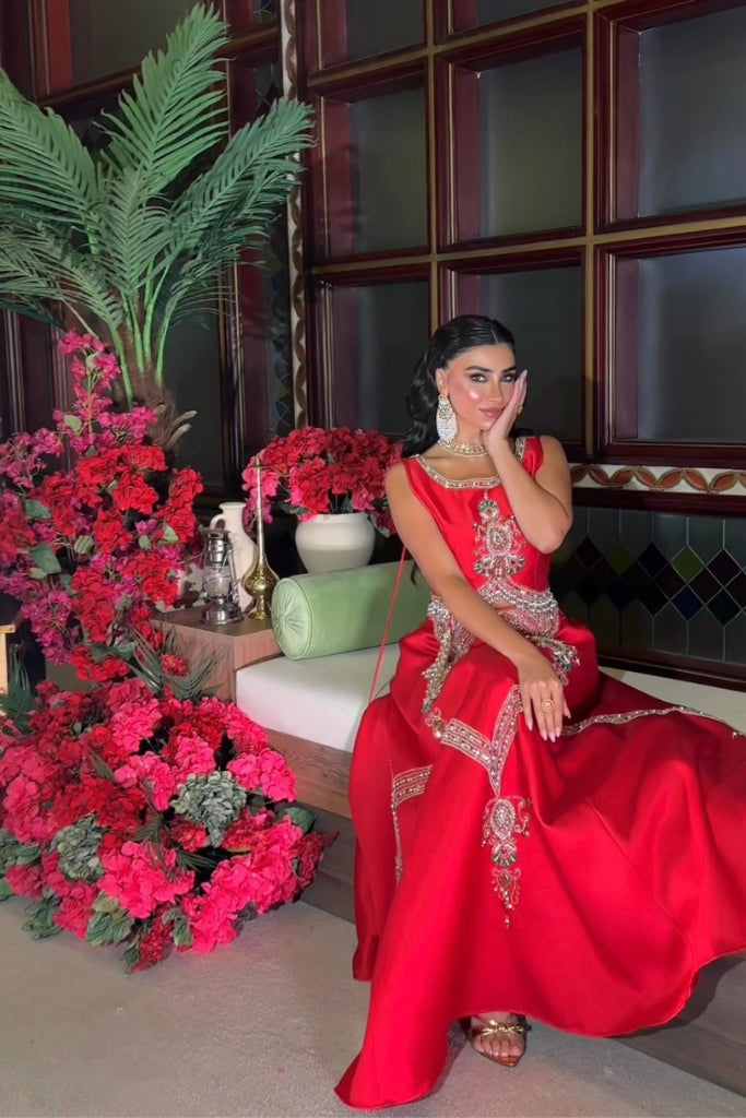 An elegant red dress made of two pieces. The fitted top is adorned with delicate bead and crystal embroidery, adding a luxurious touch. The skirt is wide and beautifully decorated with bead and crystal details, enhancing the design and giving the dress a chic, sophisticated look. This dress is perfect for special occasions, blending modern elegance with stunning opulence.